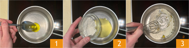 Para preparar as lasanhas de camarões e pistaches, comece pelo molho bechamel de óleo: em uma panela, aqueça o óleo 1, depois adicione a farinha 2. Mexa e forme o roux, deixando dourar por 1-2 minutos 3.
