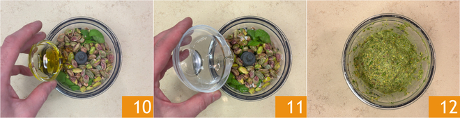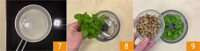 Uma vez pronto, cubra o molho bechamel com filme plástico em contato e reserve. Prepare o pesto de pistaches 7: no liquidificador, coloque as folhas de manjericão limpas 8 e os pistaches 9.