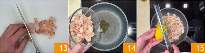 Neste ponto, dedique-se aos camarões: pique-os grosseiramente com a faca 13, depois doure-os em uma panela com um fio de óleo por alguns instantes 14. Perfume com a casca de limão 15.