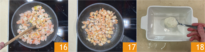 Misture para temperar 16 e apague o fogo assim que os camarões mudarem de cor 17. Você está pronto para montar as lasanhas: no fundo de uma assadeira de 20x16 cm, distribua um pouco de molho bechamel 18.