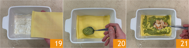 Coloque a primeira folha de massa 19, depois espalhe um pouco de pesto de pistaches 20 e adicione os camarões 21.