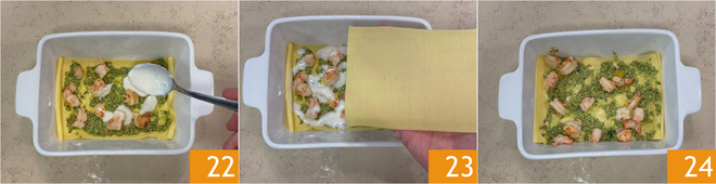 Polvilhe um pouco de molho bechamel 22, depois continue com outra folha de massa 23, pesto de pistaches, camarões 24 e molho bechamel. Continue dessa forma até terminar os ingredientes 24.
