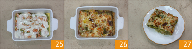Finalize com uma camada de molho bechamel 25 e asse a 180° por cerca de 20 minutos, depois continue assando por 5 minutos no modo grill a 230° para dourar a superfície 26. Suas lasanhas de camarões e pistaches estão prontas para serem servidas 27!