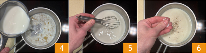 Neste ponto, despeje o leite quente 4 e continue mexendo com o batedor no fogo até que o molho engrosse 5. Tempere com noz-moscada e sal 6.