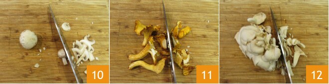 depois os champignon 10. Raspe a terra, depois corte também os chanterelles 11 e os pleurotus 12.