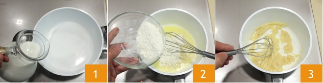 Para preparar a lasanha de cogumelos, comece pelo molho bechamel. Em uma panela, coloque o leite para aquecer 1, em outra panela derreta a manteiga em fogo baixo e depois adicione a farinha toda de uma vez 2. Misture rapidamente com o batedor para obter o roux, uma mistura compacta 3.