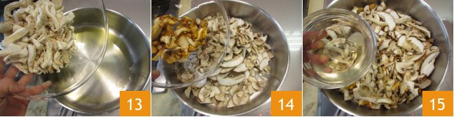 Em uma frigideira com um fio de óleo, coloque os porcini e os champignon 13, os pleurotus e os chanterelles 14. Após alguns instantes, adicione o vinho branco 15.