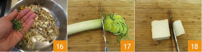 Quando o álcool tiver evaporado, salgue, apimente, perfume com tomilho fresco e cozinhe por mais alguns minutos 16. Enquanto isso, prepare o molho de taleggio. Limpe o alho-poró e corte em rodelas 17, corte também o taleggio e vá para o fogão 18.