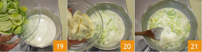 Coloque o creme de leite em uma panela e adicione o alho-poró 19. Salgue, apimente e cozinhe por cerca de dez minutos em fogo baixo. Uma vez que o alho-poró esteja macio, desligue o fogo e adicione o taleggio cortado 20. Misture bem, até que esteja completamente derretido 21.