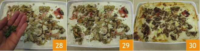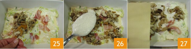 Depois adicione os cogumelos 25 e o molho bechamel 26. Repita desde o início, começando novamente com as folhas 27,