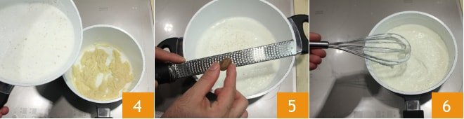 Após cerca de 1 minuto, despeje o leite aos poucos enquanto mistura com o batedor 4. Continue a cozinhar e misturar até que o molho bechamel se torne cremoso. Em seguida, desligue, ajuste o sal e a noz-moscada 5, misture e deixe esfriar cobrindo com filme plástico em contato 6.