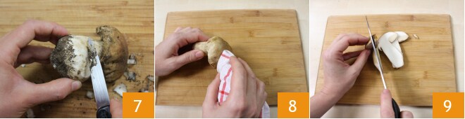 Neste ponto, passe para a Como limpar os cogumelos porcini. Porcini e champignon devem ser limpos da mesma maneira. Raspe a terra do caule 7, depois limpe a superfície com um pano 8. Se estiverem muito sujos, você pode passá-los rapidamente sob água corrente e secá-los muito bem. Fatie os porcini 9,