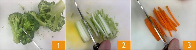 Para preparar a lasanha de crepe com legumes, primeiro corte os floretes em pedaços 1; depois, corte o aipo e a cenoura, previamente limpos, em tiras 23.