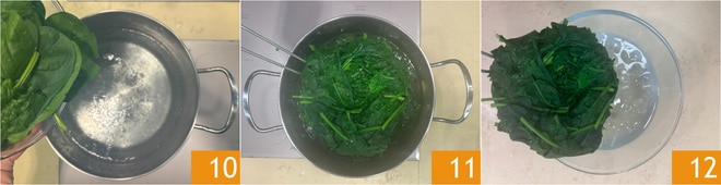 Enquanto isso, mergulhe os espinafres em água fervente salgada 10, escalde por apenas 2-3 minutos e escorra com uma escumadeira 11, em seguida, transfira-os para uma tigela com água e gelo 12; assim você interrompe o cozimento e preserva a cor dos espinafres.