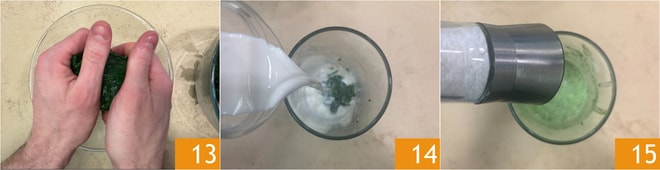 Esprema bem os espinafres 13 e transfira-os para um liquidificador; adicione o leite 14, ajuste o sal 15 e bata até obter um molho liso e homogêneo.