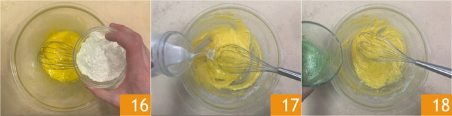 Em uma tigela, bata os ovos, adicione a farinha 16 e misture até obter uma massa lisa e homogênea, adicione aos poucos o leite 17 e por último o creme de espinafre 18.