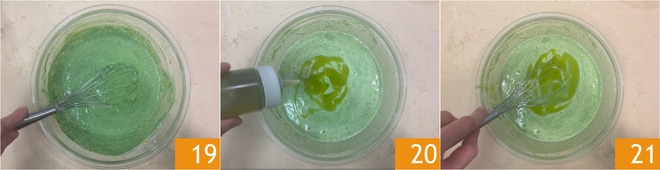 Misture bem todos os ingredientes para obter uma massa homogênea 19, adicione um fio de azeite 20 e misture novamente 21.