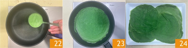 Unte uma frigideira, aqueça-a e despeje uma concha da massa 22, quando o crepe estiver cozido 23, de ambos os lados, deixe esfriar em um prato 24. Com estas quantidades, você deve obter 10 crepes.