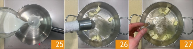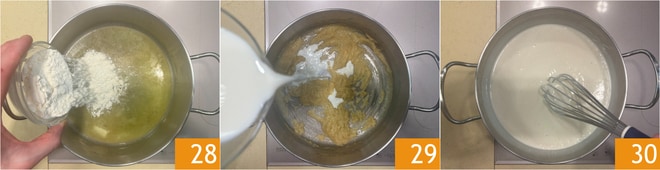 Adicione a farinha 28 e cozinhe por 2 minutos, mexendo continuamente. Adicione o leite quente na panela 29 e cozinhe, mexendo de vez em quando, até que o molho bechamel engrosse 30.