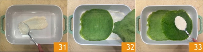 É hora de montar a lasanha. No fundo de uma assadeira, coloque algumas colheres de molho bechamel 21, coloque duas crepes de espinafre por cima 32 e continue com outra camada de molho bechamel 33.