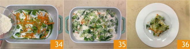 Sobre o molho bechamel, coloque muitos legumes, em seguida, adicione uma pitada de parmesão 34. Continue assim até terminar os ingredientes. Polvilhe a superfície das lasanhas com o parmesão 35. Asse em forno ventilado a 180°C por 20 minutos. Se quiser uma crosta deliciosa na superfície, mova a assadeira para a parte superior do forno e cozinhe em modo grill por mais dois minutos, tomando cuidado para não queimar. Retire do forno e deixe descansar por 5 minutos. As lasanhas de crepes com legumes estão prontas, agora é só servir 36.