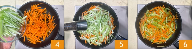 Em uma panela, coloque um fio de azeite, adicione as cenouras 4, acrescente o aipo 4 e tempere com sal e pimenta 5. Refogue em fogo alto por 5 minutos 6.