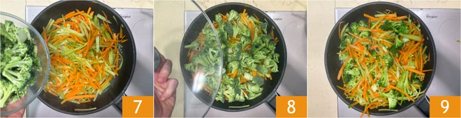 Adicione os brócolis 7, tampe 8, reduza o fogo e cozinhe por 15 minutos 9. Se necessário, acrescente água.
