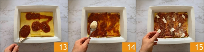 Adicione mais molho 13, depois o Grana Padano DOP ralado 14 e os cubos de mozzarella 15.