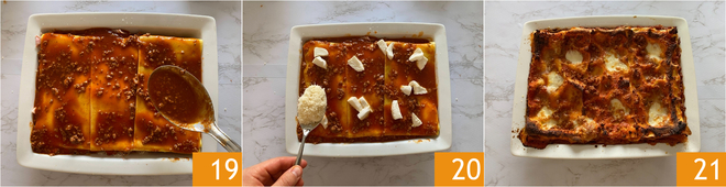 Lembre-se de que a última camada será composta apenas por massa, molho 19, queijo ralado e mozzarella 20. Cozinhe em forno estático pré-aquecido a 180°C por cerca de 45 minutos. Em seguida, retire do forno e deixe descansar por alguns minutos 21 antes de cortar e servir suas ricas lasanhas de forno!