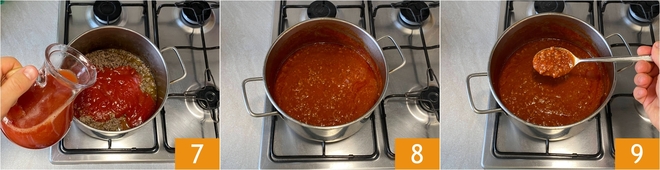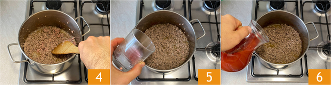 Aumente o fogo e deixe dourar, mexendo e desmanchando a carne com uma colher de pau 4. Quando estiver bem dourada, regue com o vinho tinto 5 e deixe evaporar a parte alcoólica. Abaixe novamente o fogo e adicione o molho de tomate 6.