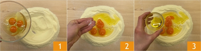 Para preparar a lasanha de radicchio, comece pela massa fresca: despeje a semolina na bancada de trabalho e forme uma fonte, depois adicione no centro os ovos 1, uma pitada de sal 2 e o óleo 3.
