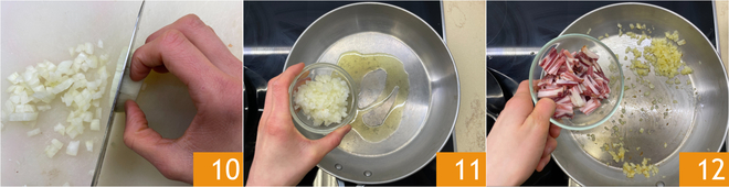 Limpe e pique finamente a cebola 10. Coloque a cebola em uma frigideira com um fio de óleo quente 11 e deixe refogar por alguns minutos. Quando estiver macia e transparente, adicione o speck 12.