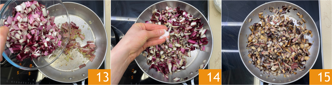 Refogue o speck por um minuto, depois adicione o radicchio 13 e sal a gosto 14. Cozinhe em fogo médio por 10-15 minutos, até que o radicchio fique macio. Desligue o fogo e deixe esfriar 15.