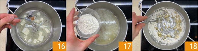 Passe para o molho bechamel: derreta a manteiga em uma pequena panela e tempere com sal, pimenta e noz-moscada 16. Enquanto isso, aqueça o leite em outra panela. Quando a manteiga estiver derretida, adicione a farinha de uma só vez 17 e mexa vigorosamente com um batedor para formar o roux 18.