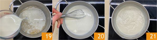 Nesse ponto, despeje gradualmente o leite quente 19, continuando a mexer para evitar a formação de grumos 20. Deixe ferver e engrossar em fogo médio até obter a consistência desejada 21.
