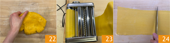 Após o tempo de descanso da massa, pegue a massa e pressione-a levemente na bancada de trabalho 22, depois passe-a na máquina de macarrão começando pela espessura mais larga até a última; você deve obter folhas com cerca de 1-2 mm de espessura 23. Corte as folhas para obter retângulos de tamanho ligeiramente menor do que a assadeira que você usará 24.