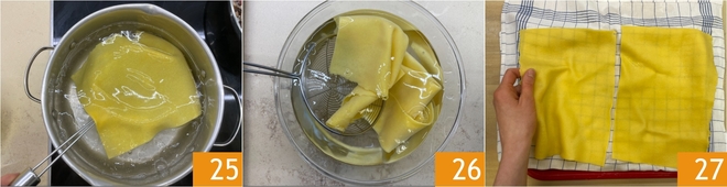Escalde as folhas em água salgada por um minuto 25, depois escorra em água fria para interromper o cozimento 26 e transfira para um pano de prato para secar 27.