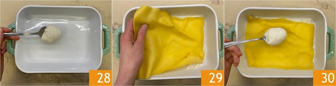 Vocês estão prontos para montar a lasanha: peguem uma assadeira de 24x18 cm e espalhem o fundo com o molho bechamel 28, depois coloquem uma folha de massa 29 e cubram com mais molho bechamel 30.