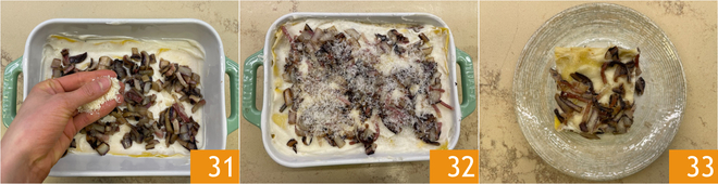Adicione a mistura de radicchio e speck, depois polvilhe com o Parmigiano Reggiano ralado 31. Continue alternando as camadas desta forma até esgotar os ingredientes, terminando com uma camada de molho bechamel, radicchio e queijo ralado. Asse em forno estático pré-aquecido a 180° por cerca de 30-35 minutos 32. Quando estiver dourado na superfície, retire do forno e deixe descansar por alguns minutos. Sua lasanha de radicchio está pronta para ser servida 33!