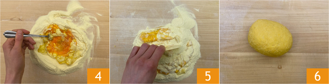 Comece a misturar os ingredientes com um garfo, incorporando gradualmente a farinha 4, depois continue à mão ajudando-se com uma espátula 5. Quando tiver obtido uma massa lisa e homogênea 6, envolva-a em filme plástico e deixe descansar em temperatura ambiente por cerca de 30 minutos.