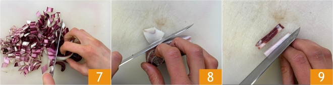 Enquanto isso, dedique-se ao recheio: lave o radicchio e corte-o em tiras 7. Retire a pele do speck 8 e corte-o em tiras 9.