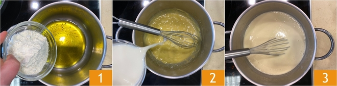 Para preparar as lasanhas veganas de aspargos e ervilhas, comece pelo molho bechamel vegetal. Em uma panela pequena aqueça 100 g de azeite extra-virgem, junte a farinha 1 e misture bem com um batedor. Despeje aos poucos a bebida de aveia 2, continuando a mexer para evitar grumos 3.