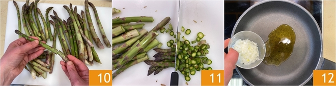 Limpe os aspargos eliminando a parte final mais dura, quebrando-os com as mãos 10; se estiverem muito grossos, você pode descascar o talo. Corte-os em rodelas 11, reservando as pontas. Em uma frigideira aqueça um fio de azeite extra-virgem e adicione a cebola bem picada 12.