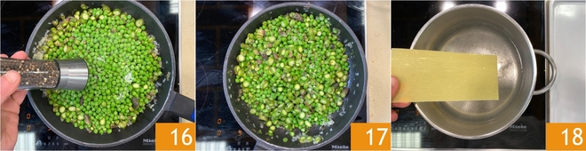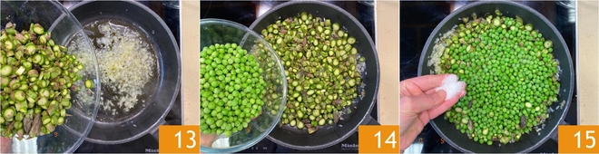 Deixe murchar em fogo baixo. Junte os aspargos 13 e as ervilhas 14, tempere com sal 15 e cozinhe por 10 minutos (se necessário, adicione 1/2 copo de água).