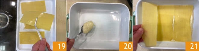 Escorra e deixe amornar sobre uma bandeja 19. Pegue uma assadeira de 25x15 cm, despeje no fundo algumas colheres do molho bechamel 20, depois disponha uma camada de folhas de massa 21.