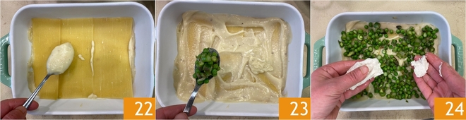 Distribua mais uma camada de bechamel 22, os legumes 23 e a mussarela vegana desfiada à mão 24.