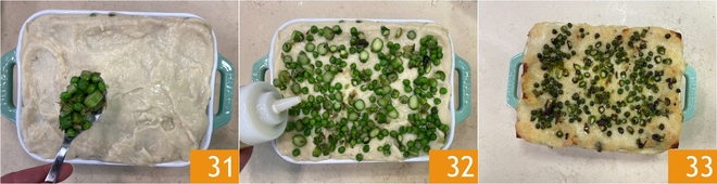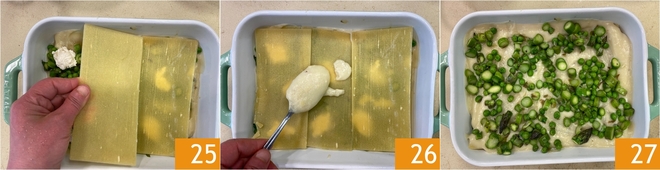 Complete com os legumes, adicionando também as pontas de aspargos cruas reservadas 31 e regue com um fio de azeite 32. Asse em forno estático pré-aquecido a 180° por 45-50 minutos. Retire do forno as lasanhas veganas de aspargos e ervilhas e deixe amornar antes de servir 33.