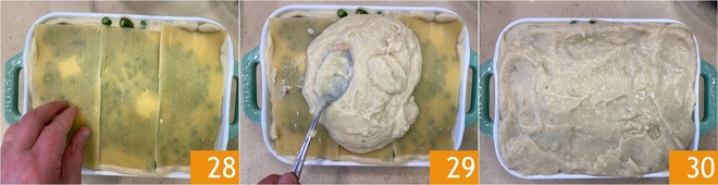 Finalize com uma última camada de massa 28 e bastante bechamel 29, distribuído de modo uniforme 30.