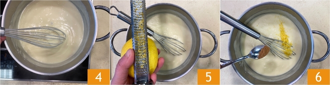 Cozinhe em fogo médio-baixo até que o molho bechamel fique cremoso 4. Tempere com raspas de limão raladas 5 e noz-moscada 6.