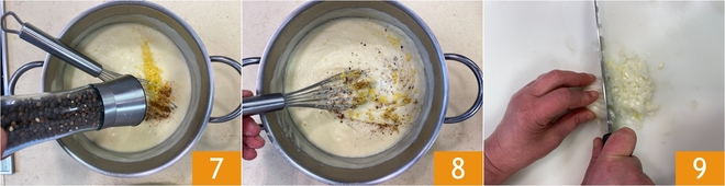 Acrescente sal e pimenta 7, misture para incorporar os temperos e deixe esfriar 8. Limpe e pique a cebola 9.